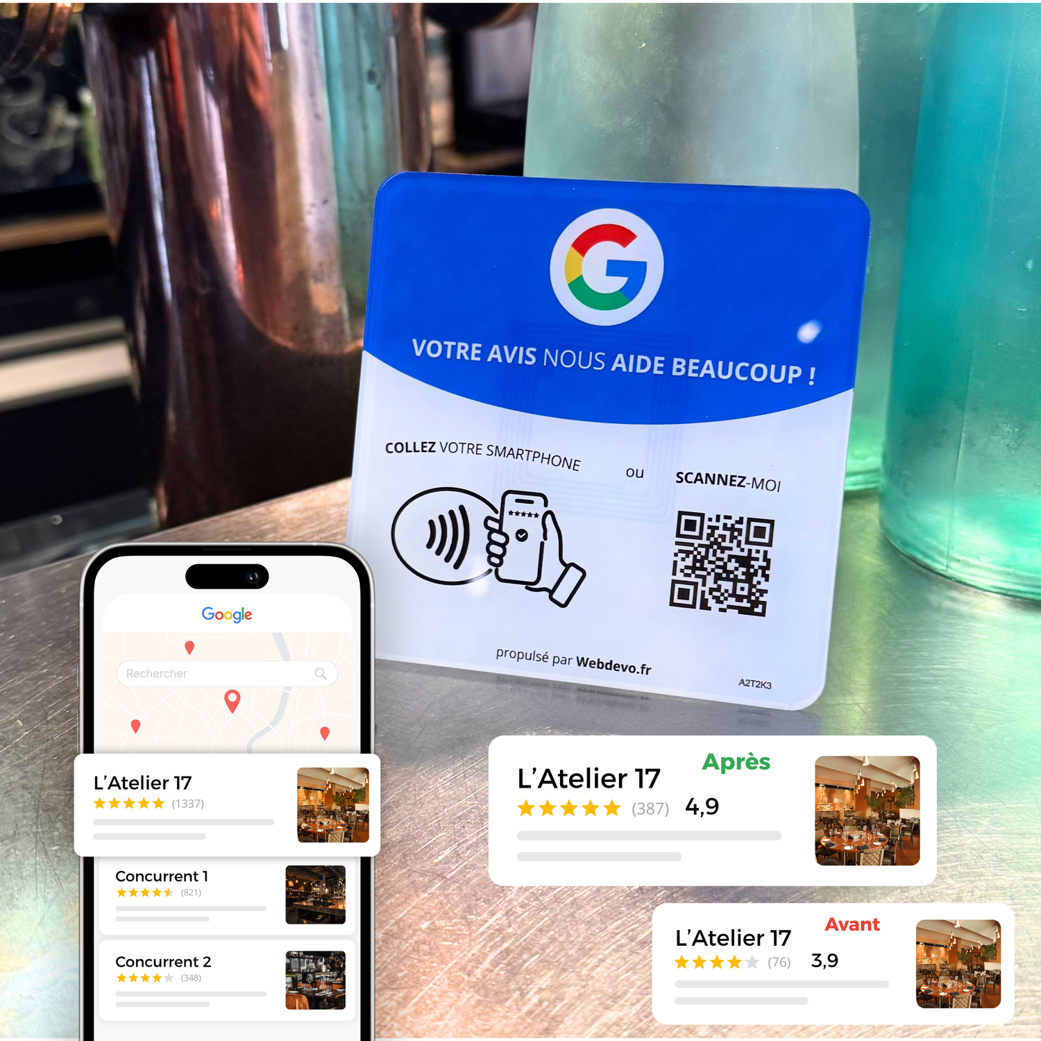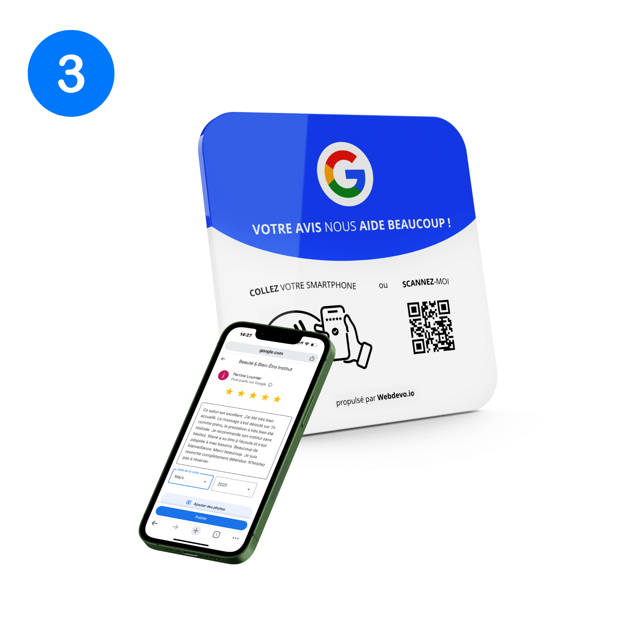 Le client approche son téléphone → votre fiche Google s’affiche instantanément.